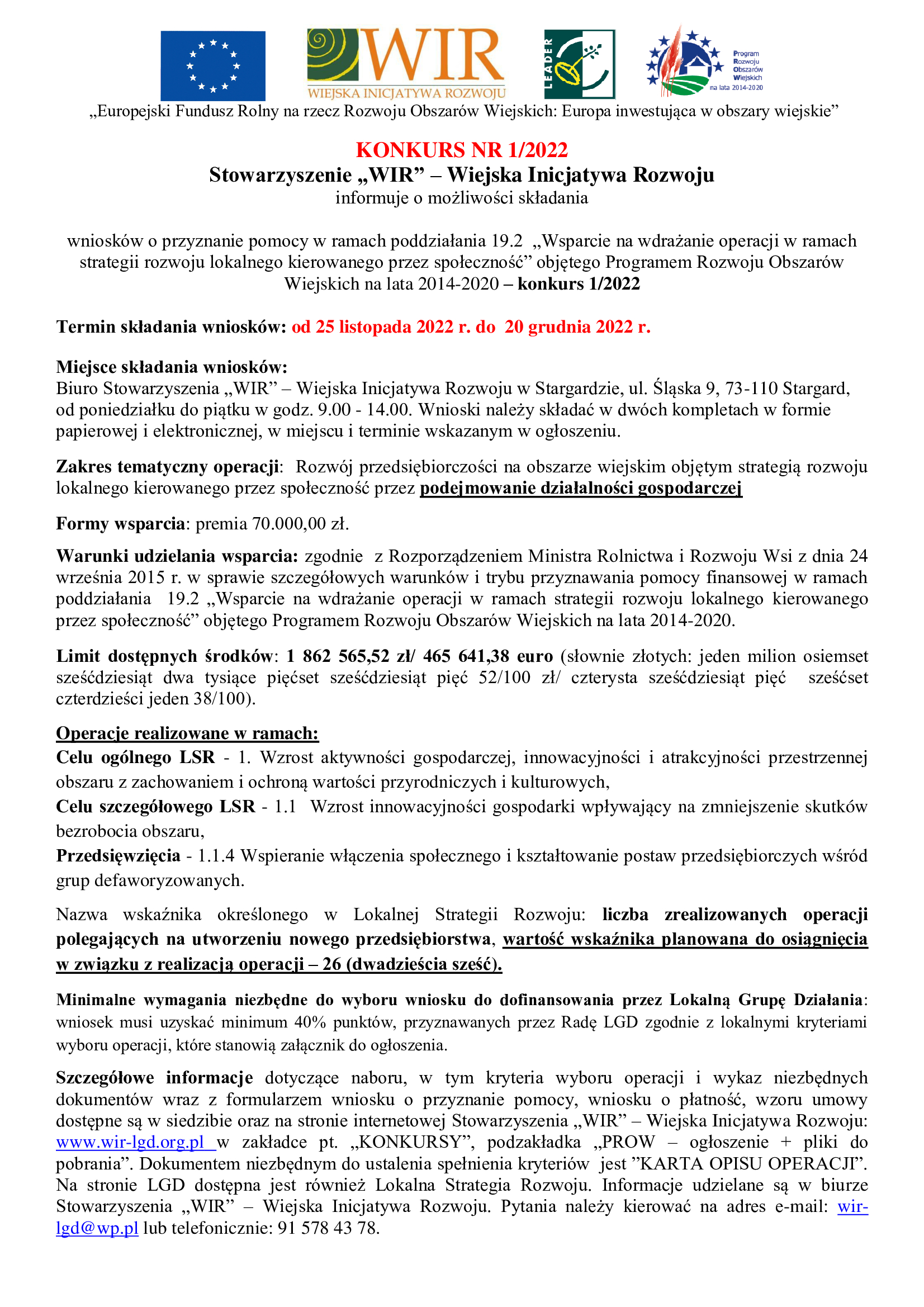 KONKURS NR 1/2022 Stowarzyszenie „WIR” – Wiejska Inicjatywa Rozwoju