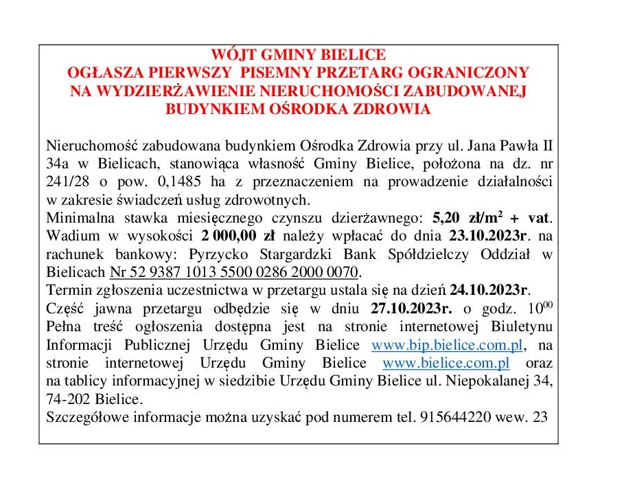 Wójt Gminy Bielice ogłasza pierwszy pisemny przetarg ograniczony na wydzierżawienie nieruchomości zabudowanej budynkiem Ośrodka Zdrowia